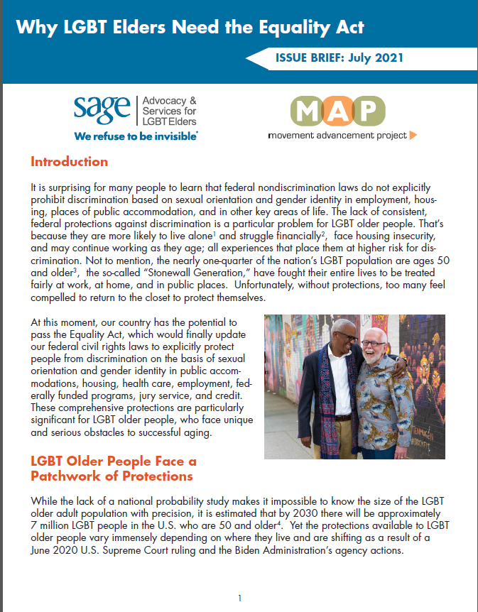 At this moment, our country has the potential to pass the Equality Act, which would finally update our federal civil rights laws to explicitly protect people from discrimination on the basis of sexual orientation and gender identity in public accommodations, housing, health care, employment, federally funded programs, jury service, and credit. These comprehensive protections are particularly significant for LGBT older people, who face unique and serious obstacles to successful aging.