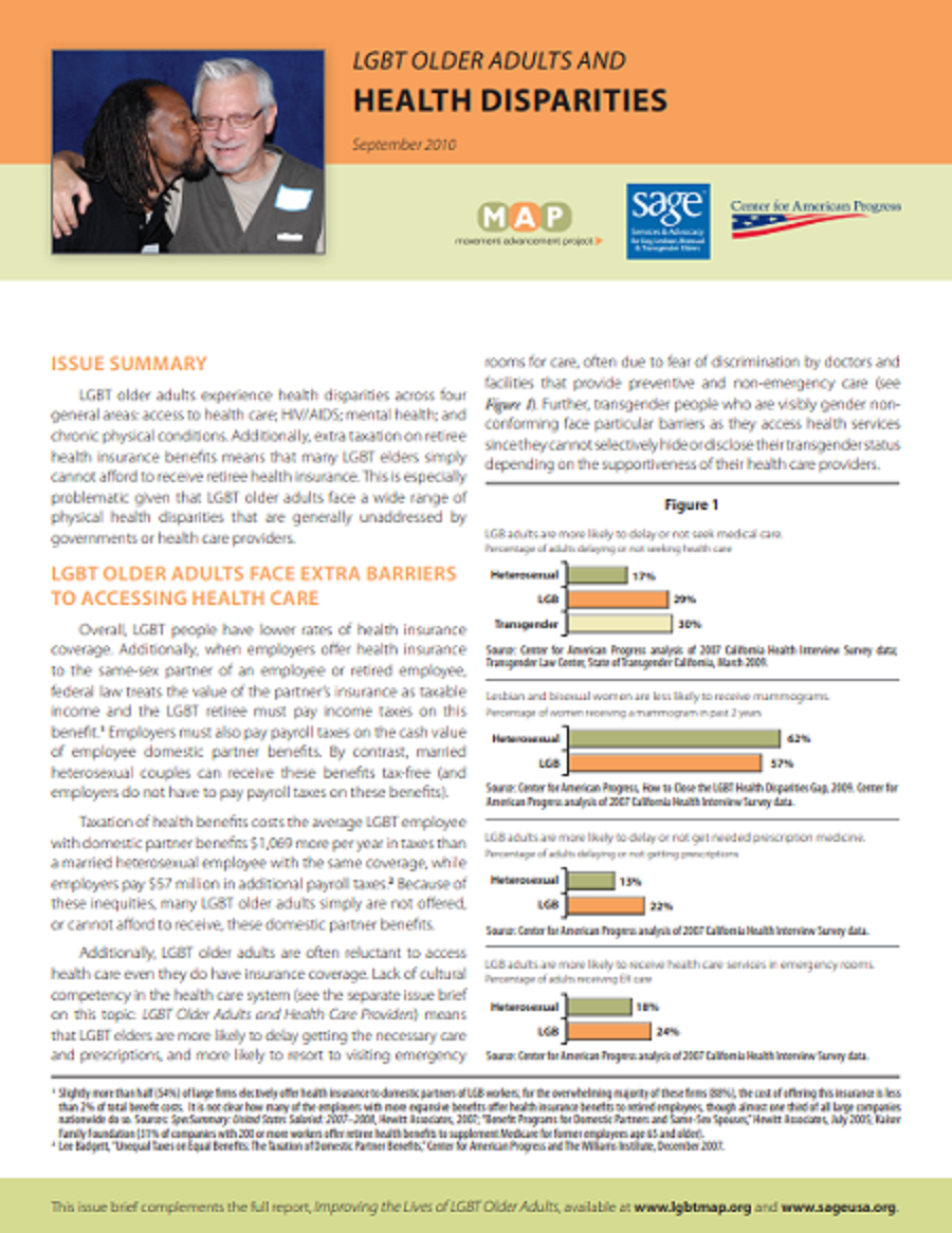 LGBT older adults experience health disparities across four general areas: access to health care; HIV/AIDS; mental health; and chronic physical conditions. Additionally, extra taxation on retiree health insurance benefits means that many LGBT elders simply cannot afford to receive retiree health insurance. This is especially problematic given that LGBT older adults face a wide range of physical health disparities that are generally unaddressed by governments or health care providers.