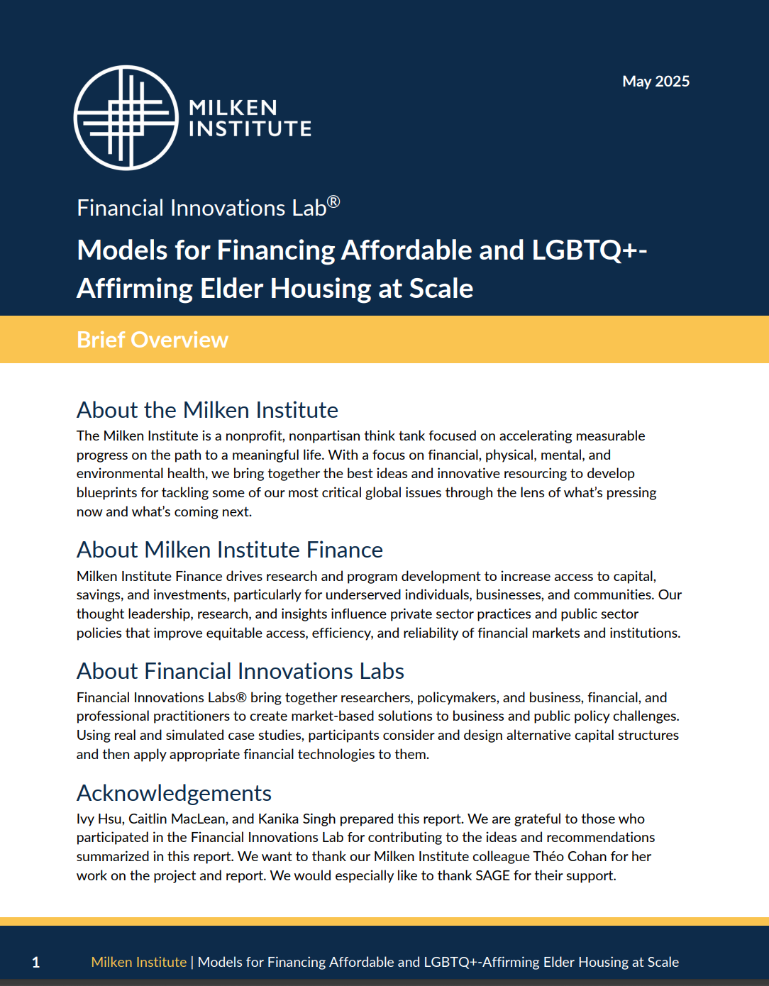 Amid the growing demand for housing in the US, there is also a need for diverse care options as many older adults prefer to stay in their homes while others will transition to communities that offer a continuum of care, from independent to assisted living services. Unfortunately, many of these options are costly and out of reach for low and middle-income Americans. In response, in 2024, the Milken Institute released a Financial Innovations LabsĀ® report, Innovative Financing and Care Models to Scale Affordable Housing Solutions for Middle-Income Older Adults, which outlined four market-based recommendations on advancing the affordable housing market for middle-income seniors.