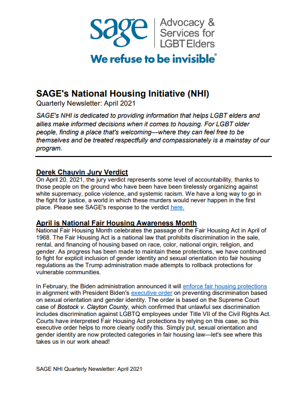 SAGE’s National Housing Initiative (NHI) is dedicated to providing information that helps LGBT elders and allies make informed decisions when it comes to housing. For LGBT older people, finding a place that’s welcoming—where they can feel free to be themselves and be treated respectfully and compassionately is a mainstay of our program. Check out our quarterly newsletter for important updates and information.