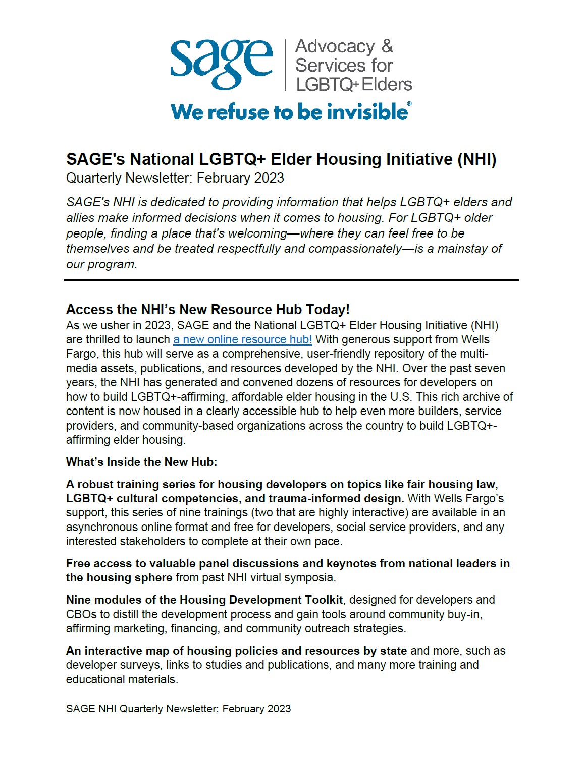 SAGE’s National Housing Initiative (NHI) is dedicated to providing information that helps LGBT elders and allies make informed decisions when it comes to housing. For LGBT older people, finding a place that’s welcoming—where they can feel free to be themselves and be treated respectfully and compassionately is a mainstay of our program. Check out our quarterly newsletter for important updates and information.