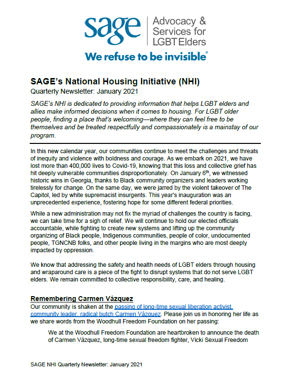 SAGE’s National Housing Initiative (NHI) is dedicated to providing information that helps LGBT elders and allies make informed decisions when it comes to housing. For LGBT older people, finding a place that’s welcoming—where they can feel free to be themselves and be treated respectfully and compassionately is a mainstay of our program. Check out our quarterly newsletter for important updates and information.