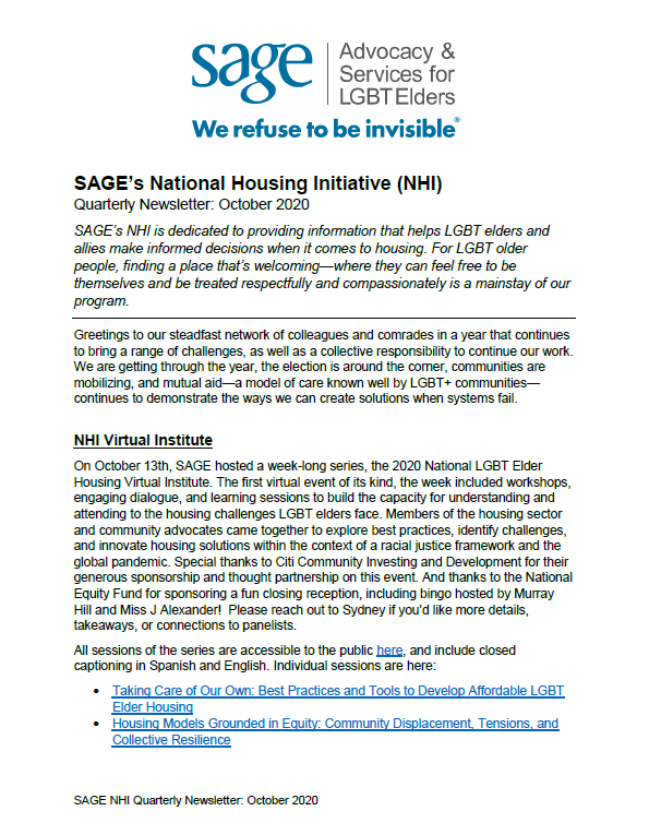 SAGE’s National Housing Initiative (NHI) is dedicated to providing information that helps LGBT elders and allies make informed decisions when it comes to housing. For LGBT older people, finding a place that’s welcoming—where they can feel free to be themselves and be treated respectfully and compassionately is a mainstay of our program. Check out our quarterly newsletter for important updates and information.
