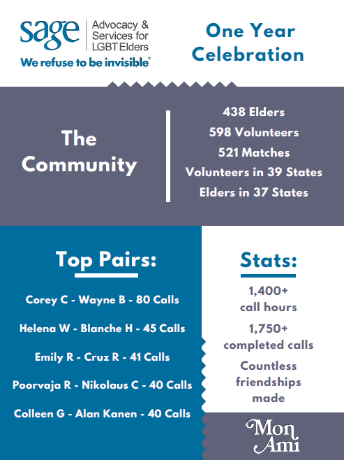 SAGEConnect was created in the midst of the COVID-19 pandemic to combat social isolation through weekly calls with a community volunteer. Now, after one year, we are celebrating over 1750 calls, over 1400 hours spent talking, and the many friendships that were formed.