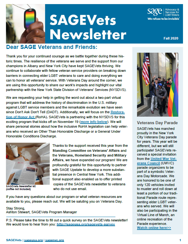 Check out the fall issue of the SAGEVets newsletter for important updates and information about Veterans Day, caregiver resources, and how SAGE is helping mitigate the impact of COVID-19 on LGBTQ+ veterans.